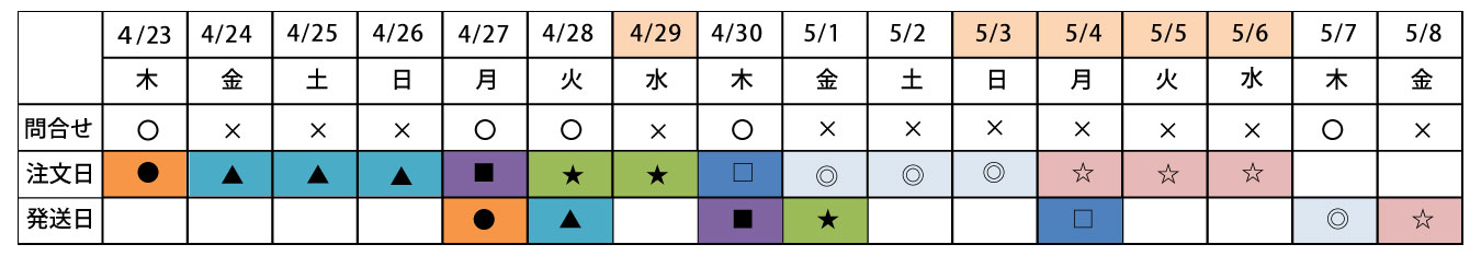 ・4月23日(木) のご注文:4月27日(月) 発送予定(●)